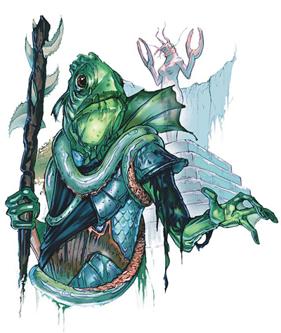 Finalmente salimos victoriosos, y los que seguimos en pie nos acercamos a los caídos para curarles: Silge a Sarith (cada vez están más unidos), Breina a Farlee (esto ya es un clásico) y Oroko a Shuushar. Kanelitah, por su parte, se dedica a buscar su bastón, pegado en el escudo de un Kuo-Toa caído. Y justo en ese momento aparecen otros 6 Kuo-Toas, amigos de Shuushar, cuyo líder se llama Ploopploopeen, arcipreste del culto a la Madre Marina, y nos dice que somo el grupo elegido para ayudarles a vencer en el enfrentamiento que mantienen con otros Kuo-Toas, que veneran a una nueva deidad, la Madre Profunda, entre ellos el grupo contra el que acabamos de pelear.