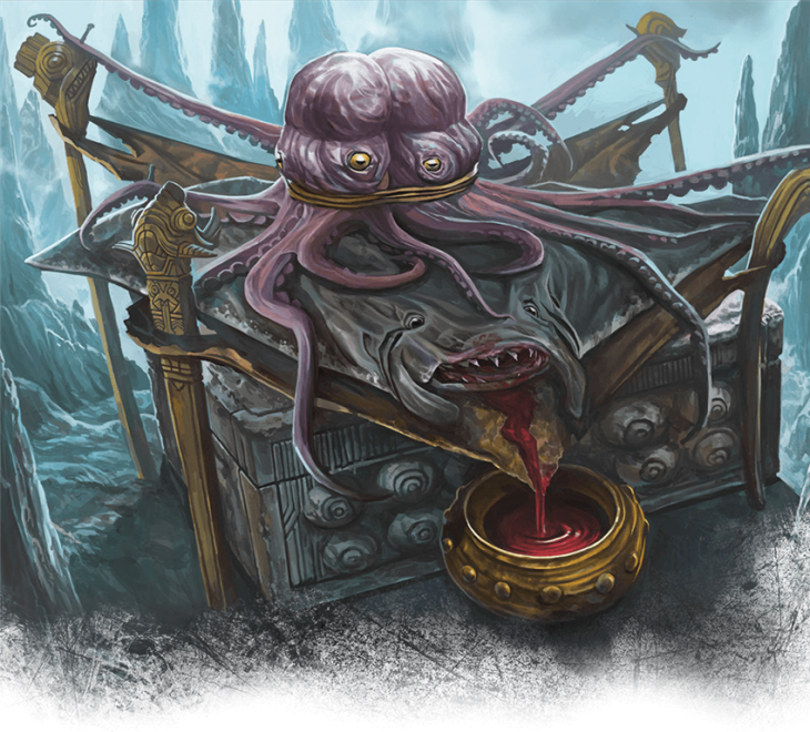 Al parecer, todos vivían bien en el poblado rindiendo culto a la Madre Marina, hasta que un día llegaron unos adoradores de la Madre Profunda, cuya figura dirigente es Bloppblippodd, y se dedicaron a convertir a la mitad de los habitantes (entre ellos 1 hijo de Ploopploopeen); los seguidores de esta nueva deidad consiguen poderes mágicos y realizan ofrendas humanas y de otros seres, en su altar para mantener esos poderes. La propuesta de Ploopploopeen es que nos dejemos atrapar y que seamos presentados como ofrendas para la Madre Profunda, en un intento por limar asaperezas entre los 2 bandos; para eso tienen que llevarnos con las manos atadas, pero van a estar mal atadas para que podamos liberarnos en el momento adecuado y iniciar una reyerta como distracción para que Ploopploopeen y los seguidores de Madre Marina, pueda matar a Bloppblippodd. A cambio nos ofrece descanso (en un lugar seco) y comida hasta que se ponga en marcha el plan… como estamos cansados y hambrientos, aceptamos la propuesta y vamos con ellos, maniatados pero con las cuerdas flojas.